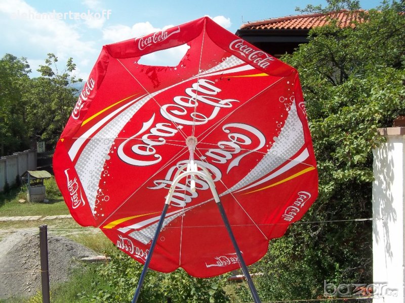 Чадърите за ремонт са с диаметър -180см , а здравите -160см са с чупещо се рамо и са използвани само този сезон.Цена за брой 20лв. Рекламен колекционерски чадър за слънце на Coca Cola -Heyland Fox Sheffield England за ремонт /снимка 8/-50лв. Цените може да се коментират.