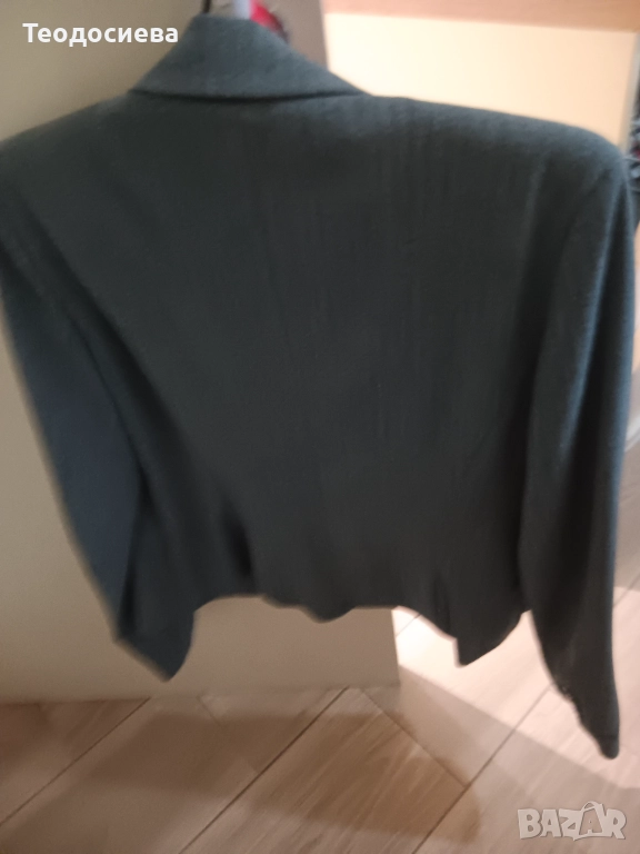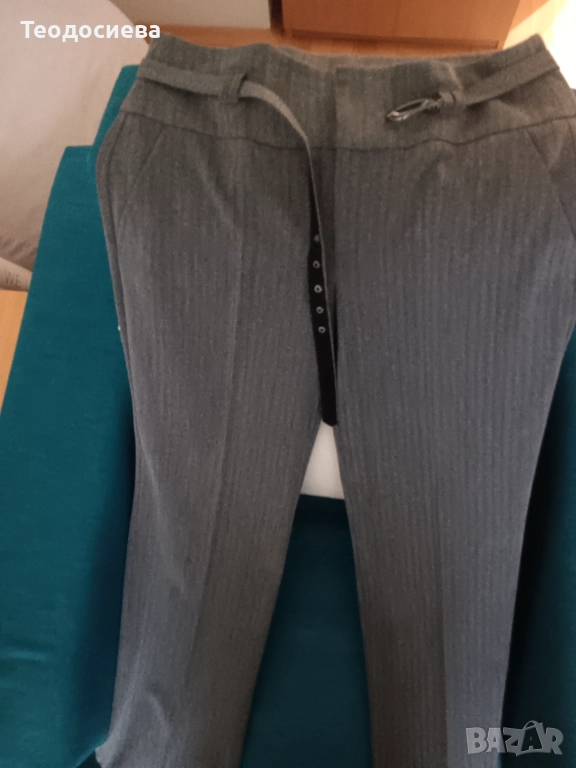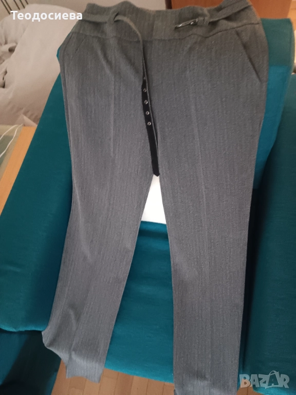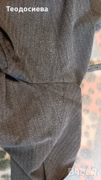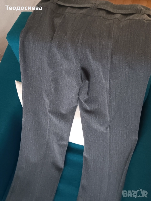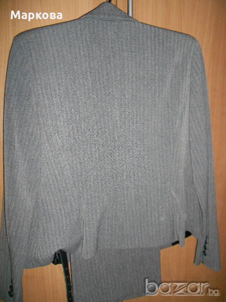 Стилен дамски костюм DIKA. 79% полиестер. 17% вискоза. 4% ликра. Панталонът е с колан и два предни джоба. Дължина на понталона - 104 см. Дължина на чатала - 80 см. Сакото е с два джоба и се закопчава с две копчета. Обличан веднъж. 42 номер. В отлично състояние. Панталонът има протриване между краката в горната част,видно от снимките. Като се изключи това, костюмът е като нов.