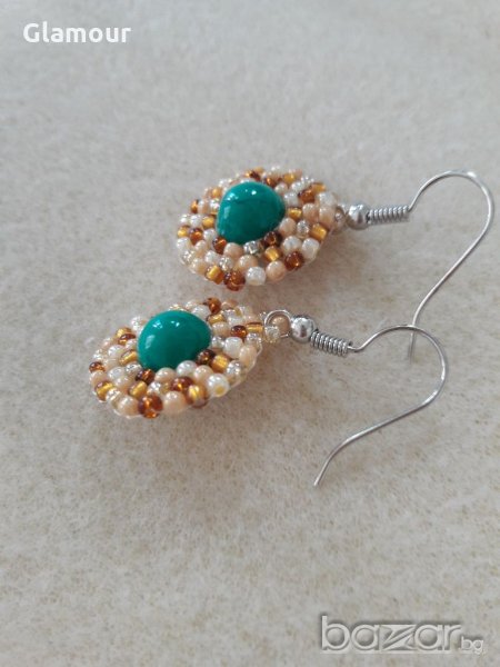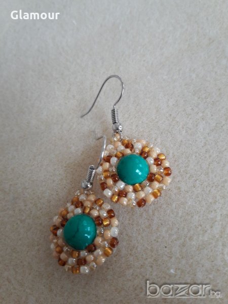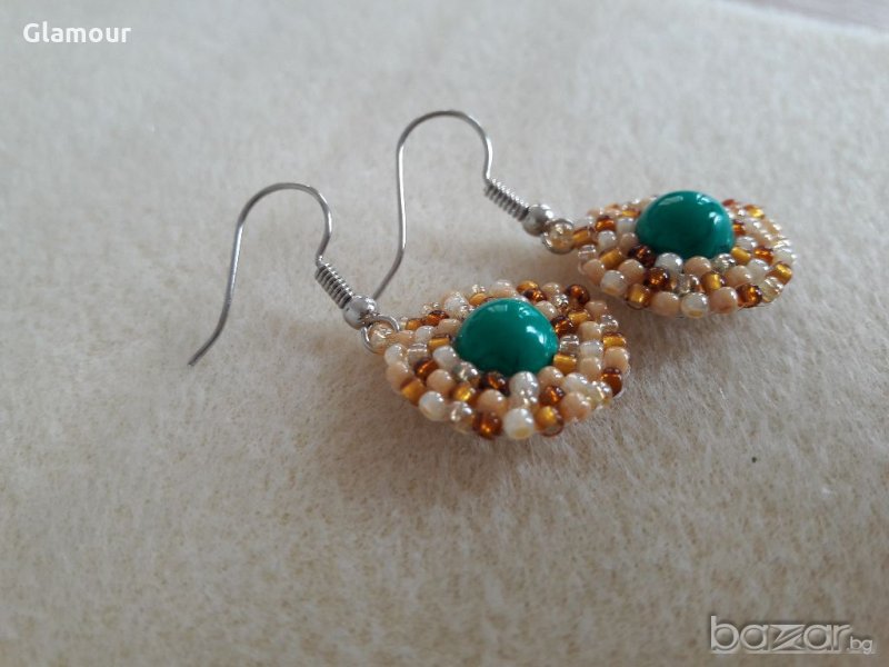 Обеците са изработени със зелен тюркоаз и мъниста тохо.Кукичките за обеци са метални,диаметъра на висулката е 1.8 см.,дължина/вкл.кукичките/3.5 см.