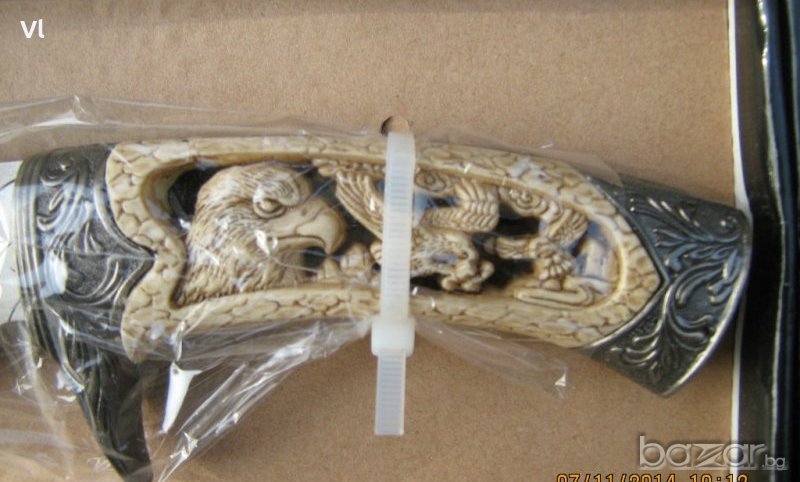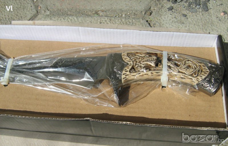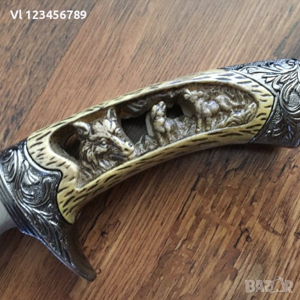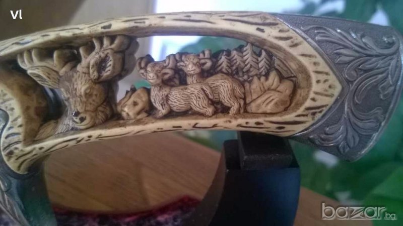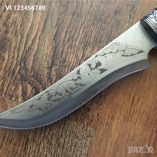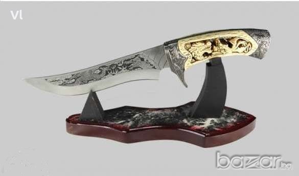 нож с инкрустации по острието и дръжката, изобразяващи ловна сцена. Изработен от неръждаема стомана и красива барелефна дръжка със същата ловна сцена. Комплект с дървена стока за експониране.Нов,Декоративна кутия