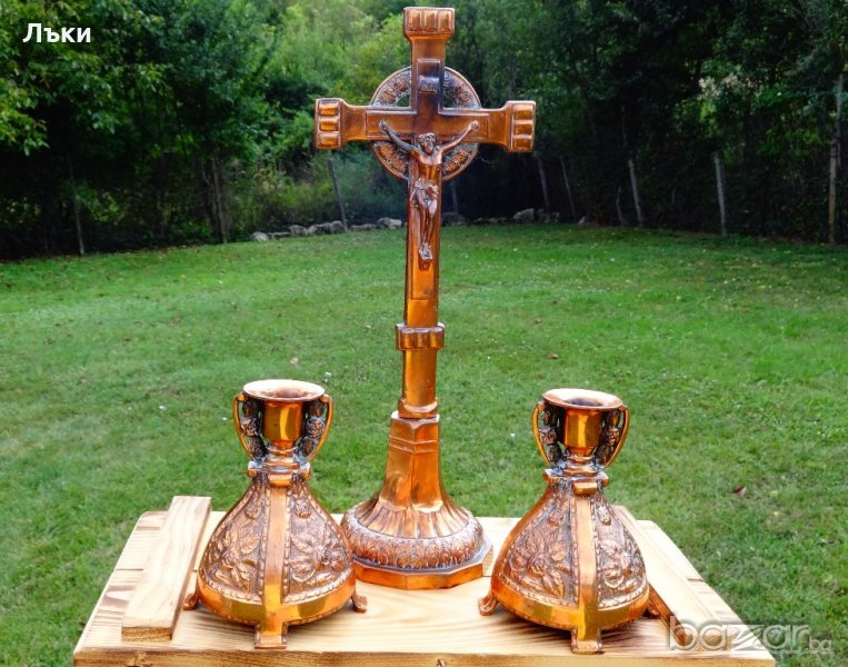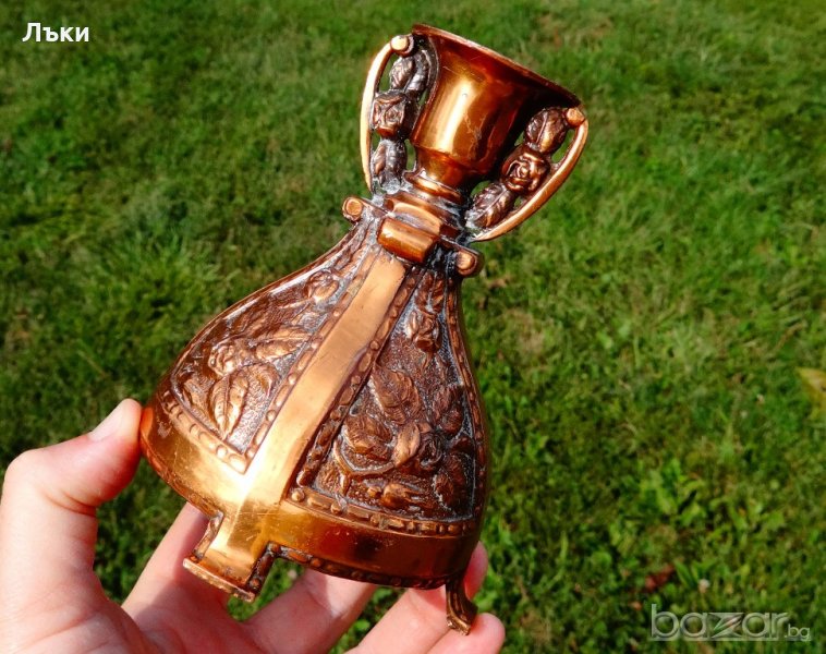 Старинен свещник,майсторска ръчна изработка от калай с дебело медно покритие,релефно декориран с рози в стил барок.Изработен в Белгия.Височина 13 см.,диаметър на основата 10 см.,тегло на всеки 350 гр.Налични 2 броя,цена 12 лв.,за брой.