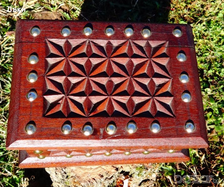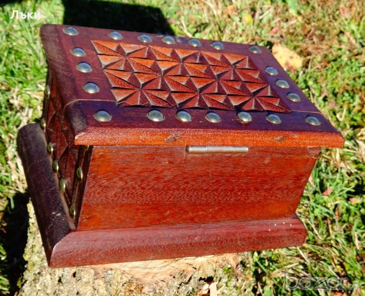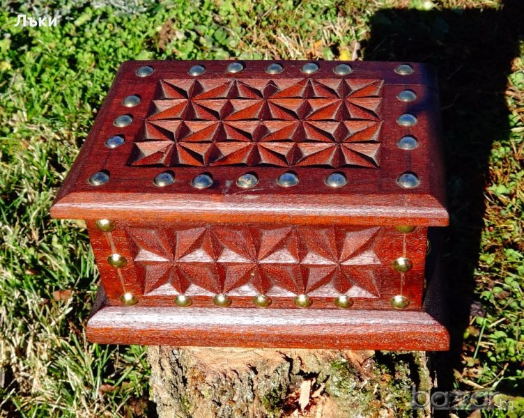 ръчна изработка от красиво резбовано масивно естествено дърво с обков от месингови клинове.Размери 17 х 12.5 х 10 см.Има стабилна месингова панта - отваря се лесно и се затваря плътно.Перфектна.