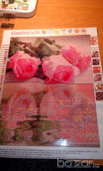 + купичка за мъниста и картина с фолио,която има готово нанесен слой лепило и по дадените цветове се залепват камъчета,много лесно,приятно и отморяващо,подходящо дори и за деца, не изисква особена сръчност и умения.