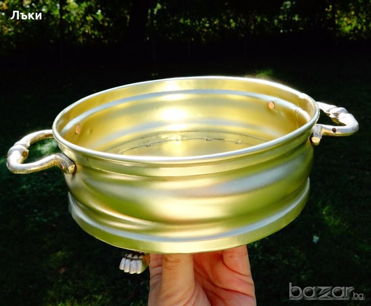 дръжки,здраво закрепени с медни нитове.Стои стабилно на три крачета-лъвски лапи.Височина