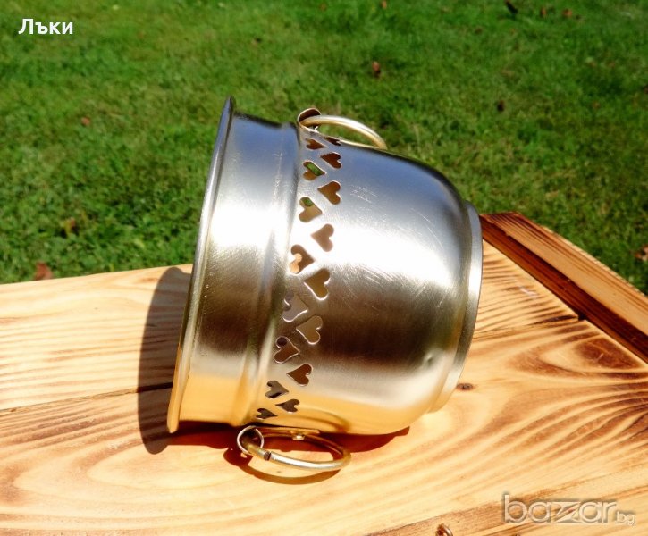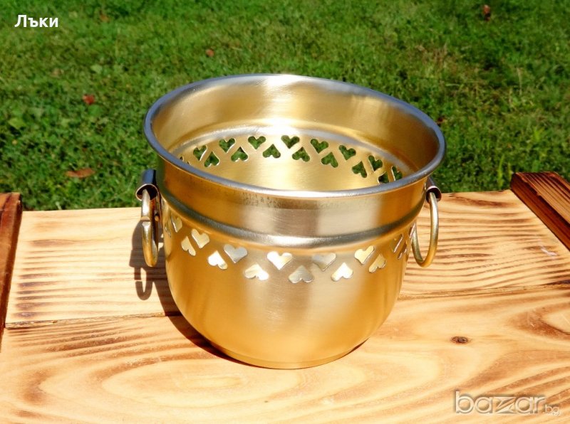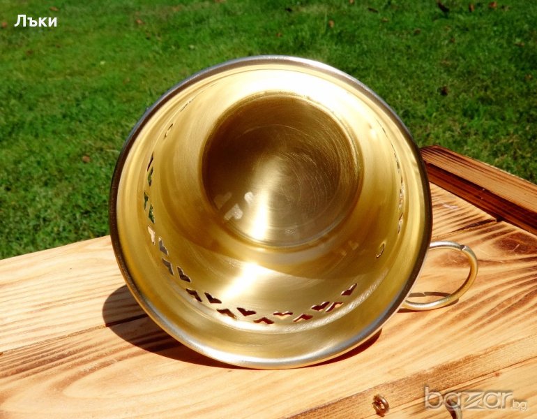 изработка с нежен ажур от сърчица и две стабилни халки за окачване.Златен блясък.Височина 9 см.,диаметър 12 см.,тегло 180 гр.Отличен.