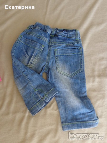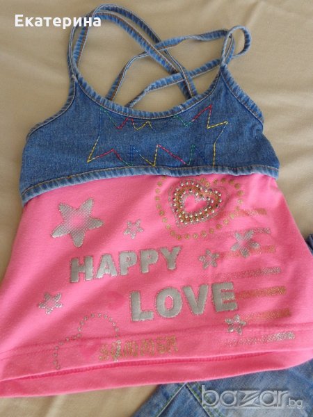 Комплектът стои страхотно, с кръстосани презрамки на гърба. По етикет дънките са 98 см, но според мен стават за по-голямо дете.
