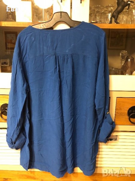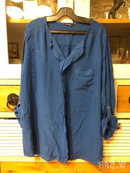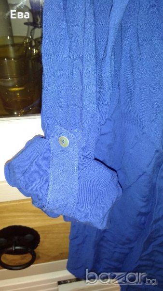 Дамска риза LC Waikiki, 100% вискоза. Цвят турско син. С остро деколте, дълъг ръкав и волан отпред. Джобче от лявата страна. Ръкавите могат да се навият и закопчаят посредством коланче зашито от вътрешната страна на ръкава.