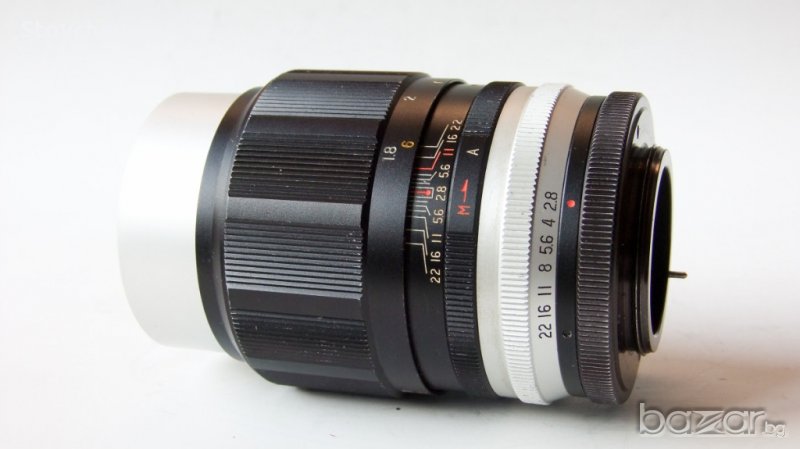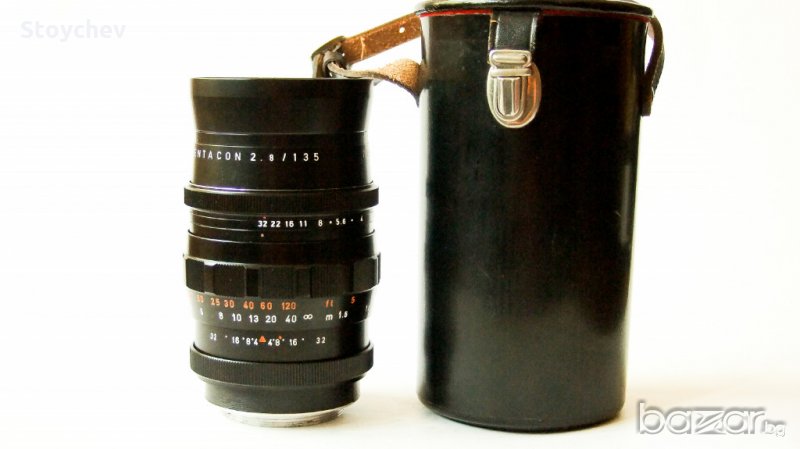 Pentacon 135 mm f/2.8 preset. Резба М42, preset. Обектив произвеждан в периода 1966-1978г., определян като «Bokeh Monster» и «Bokeh King». 15 ламела на блендата. Много добро състояние на обектива. Корпус с минимални следи от употреба, оптика без забележки, мек ход на фокус пръстена, функционираща бленда. Окомплектовка: оригинален тубус, оригинален сенник, капачки. 160 лева. Неналичен