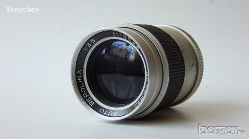 Auto Berolina 135mm 1:3.5. Резба М42 с М и А превключвател. Много добро състояние на обектива. Корпус с минимални следи от употреба, чиста оптика, мек ход на фокус пръстена, функционираща бленда в двете позиции. Резба за филтър 52мм. Две капачки. 90 лева.