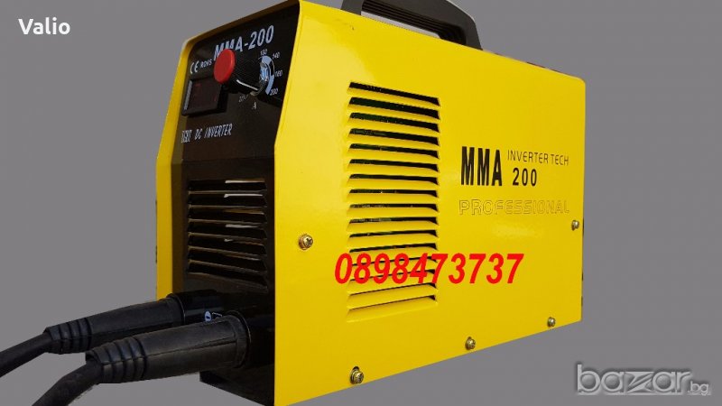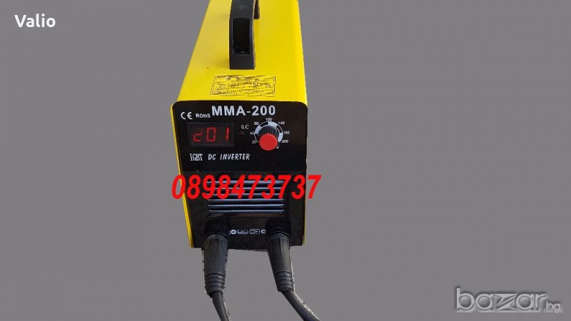 електрожени MMA 200. Това са електрожени с най-новата разработка на базата на IGBT транзистори, предназначени за извършване на прецизни заваръчни дейности с всички видове електроди. Предимствата на тези електрожени са: Намалено импулсно натоварване на мрежата – за предприятия, които имат ограничение на мощността на електрическата мрежа прилагането на IGBT технологията позволява да се инсталират повече заваръчни постове. Заваряването не причинява смущения в мрежата – енергията, запасена в кондерзаторната група, изглажда падовете и пиковете по линията дори в момента на заваряване. Прецизен контрол на заваръчният ток- комутацията на напрежението се осъществява с IGBT транзистори. Те се включват и изключват с честота от 800 до 4000 пъти за секунда. За разлика от всички други заваръчни апарати, които се включват от заваръчното управление, но остават включени, докато мрежовото напрежение премине през ”0”, то при транзисторите се управлява както включването така и изключването, което позволява прецизно управление на заваръчния ток. Включването и изключването на транзисторите /за разлика от всички други заваръчни методи/ е управляемо и алгоритмите за управление на заваръчния процес са предсказуеми. Само времето, през което IGBT транзисторите са включени (ширината на импулса), определят енергията, която се подава към заваръчния апарат.Технически характеристики:инверторен електрожен за ръчно електродъгово заваряване - IGBT технология вградени функции:Функция Hot Start - за лесно запалване на дъгатаФункция Anti Stick - прекъсване на захранването, за избягване на залепването на електрода за материалаФункция Arc Force - регулиране динамиката на дъгатаЗащита от пренапрежение.Малки размери- д/Ш/в : 26/12/15см. Захранващо напрежение: 220 VЗахранваща мощност: 3,9 kVA Електроди: до 3.25 мм включително.Степен на защита: IP23Тегло на целия комплект: 6,0 кгТегло само на електрожена- 3,8кгВ комплект със заваръчни кабели,чукче и маска