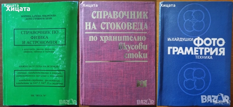 Биологичен контрол и управление на водопречистването,Яна Топалова,2009г.360стр.С посвещение и автограф от авторката.Отлична! - 70лв.Енциклопедичен речник на младия астроном,Народна просвета,1987г.350стр.Твърди корици! - 60лв.Справочник по физика и астрономия.С константи,закони,формули,графики,таблици и чертежи,Вега 74,2004г.360стр. - 40лв Геодезическа астрономия,Владимир Кирилов Христов,Техника,1967г.360стр.Отлична! - 80лв Природни екокатастрофи и тяхното дистанционно аерокосмическо изучаване,Гаро Мардиросян,АИ "Проф. Марин Дринов",2000г.388стр. - 55лв Демонстрация по неорганична химия,Е.Киркова,Е.Радкова,Г.Георгиев,И.Атанасова,УИ "Св. Климент Охридски",1994г.288стр.Отлична! - 60лв Животът. Малка биологична енциклопедия, Наука и изкуство ,1992г. 796стр. - 70лв Наръчник по биология,Народна просвета,1981г.320стр. - 40лв Фотограметрия,И. Хайдушки,Техника,1978г.486стр. - 50лв