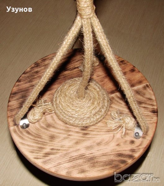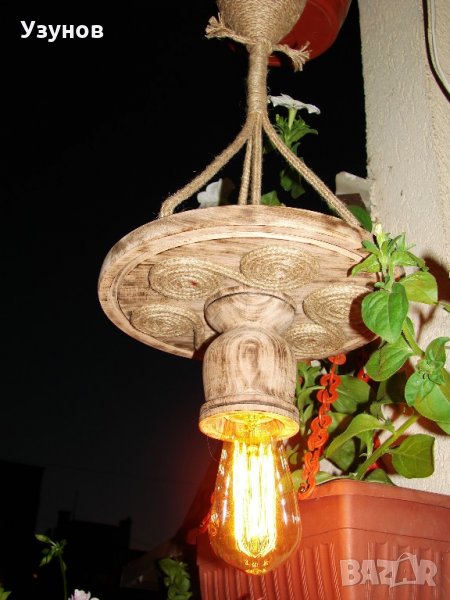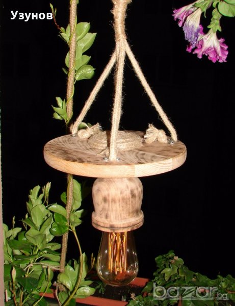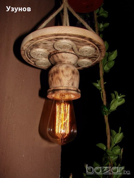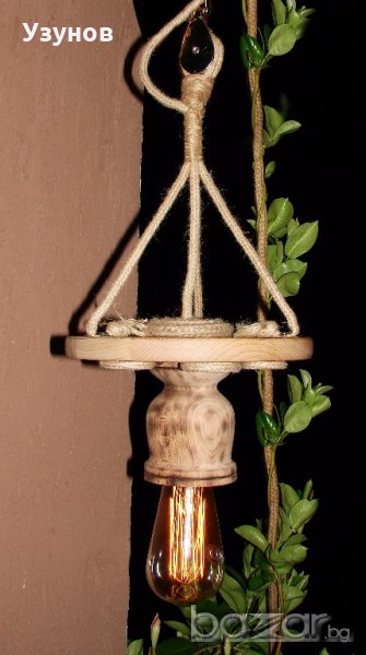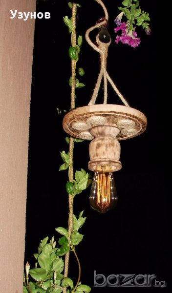 Продавам уникална, ръчно изработена дървена лампа, наречена от мен "Гайтан" - осветително тяло от естествени, ръчно обработени материали - обгорено липово дърво, керамична фасунга, въжета от юта и коноп - ръчно декорирана.