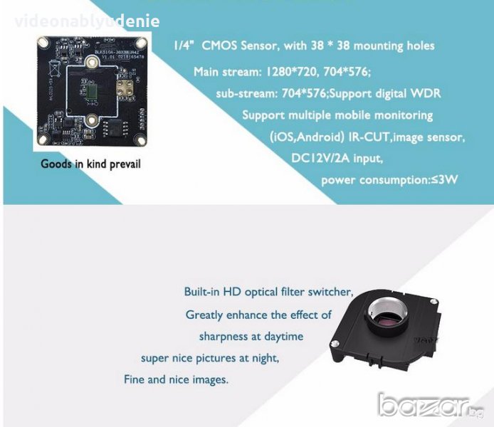 720P 1/4' 'OH42 Progressive Scan Мегапикселов Сензор, Цветно:0.1lux/F1.2, черно/бяло: 0.01lux/F1.2