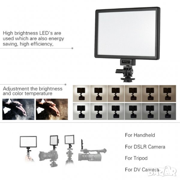 Тип: LED видео светлина (регулирайте яркостта и цветната температура)