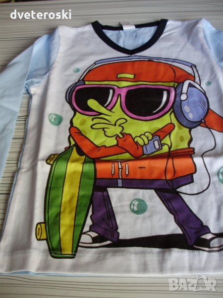 Спондж Боб. Горнището е с предница в бяло с щампа, а гръб и ръкави в светло синьо, панталон в тъмно синьо. Размер 104 на цена 11,50 лв - Горнище: дължина 43, ширина под мишници 32, дължина ръкав 37 от рамото, Долнище: дължина 60 см от ластика, ханш 33, дълбочина 21 см, ширина на ластика 20 см, разпънат 35