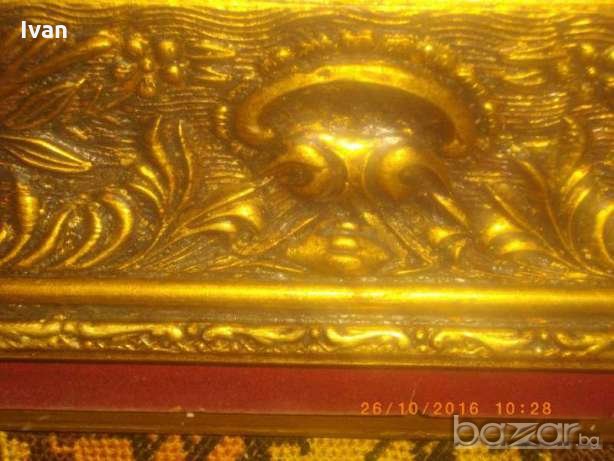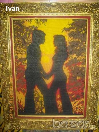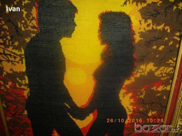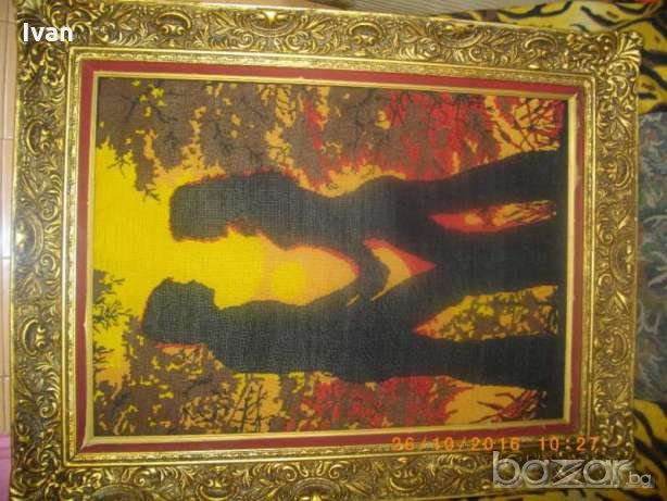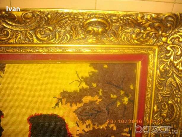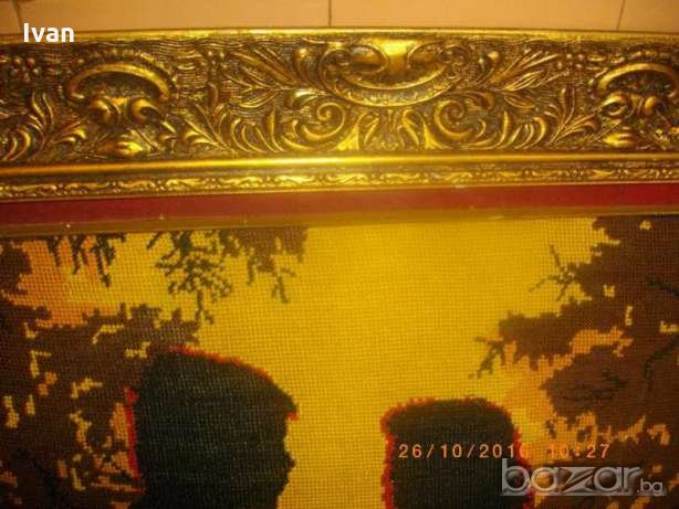 голям гоблен,ръчно бродиран с висококачествени DMC конци.Размери с рамката-86 см дължина,ширина-66см.Масивна,изцл гипсова рамка,стил Барок,със старинни ренесансови елементи и компоненти.Широчина на рамката вътрешна към гоблена-80мм.Гръб-картон с фабрична маркировка на гръцки език,и масивна кука за окачване на стена.Гоблена и рамката са прецизна изработка.В отлично състояние.Сюжет-двойка влюбени,на фон на залязващото слънце.Цветовете на конците са наситени,реално обагрени.