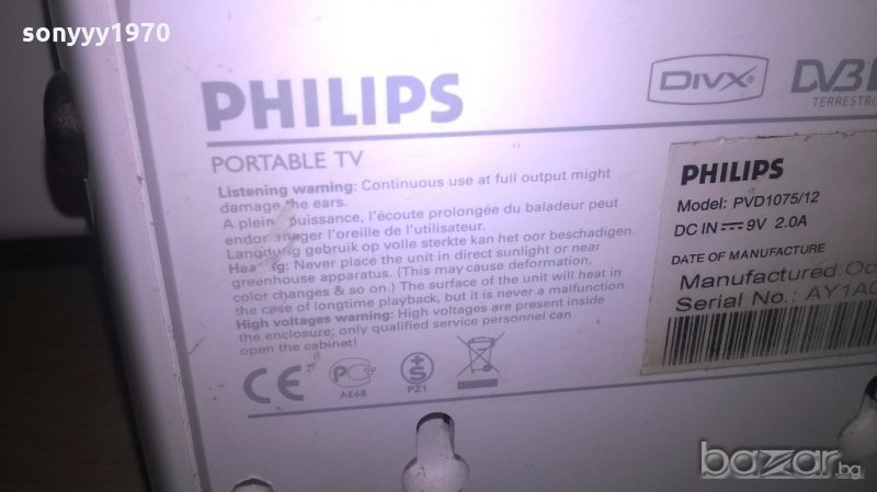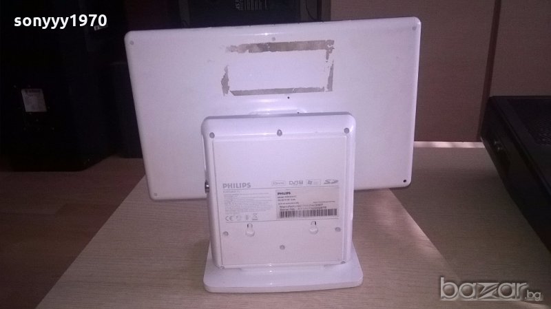 Philips pvd1075/12 tv/dvix/dvbt/usb/sd-работи на 9в-внос швеицария...НА ТВ ЗВУК ИМА КАРТИНА НЕ-НА ФЛАШКА Е ОК-без захранване е...подходящо за кола/бус/дома...на 9-12волта има цифров тунер юсб и всичко друго...поставка с колони вградени вътре-пращам с еконт с преглед и тест-краина цена-още над 11000 обяви тук