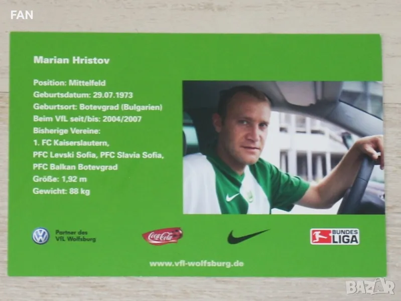 Предлагам оригинална футболна картичка с АВТЕНТИЧЕН саморъчно написан автограф с маркер на Мариян Христов с екипа на германския клуб Волфсбург от сезон 2006/2007.