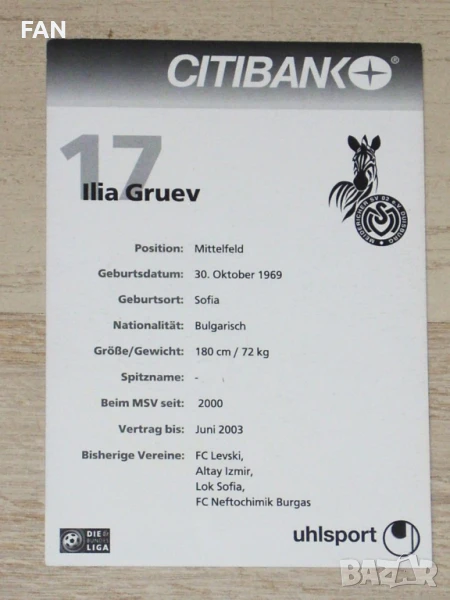 Предлагам оригинална футболна картичка с ОРИГИНАЛЕН саморъчно написан автограф с маркер на Илия Груев с екипа на германския клуб Дуисбург от сезон 2001/02.