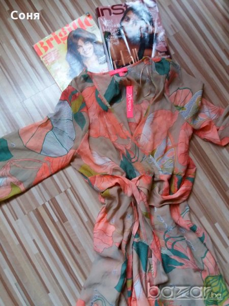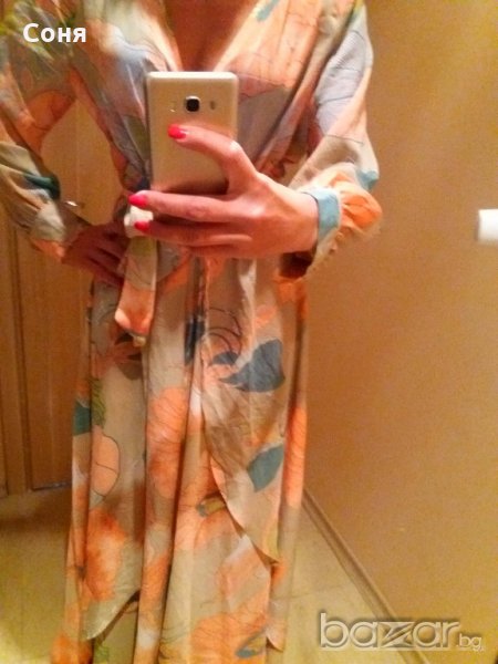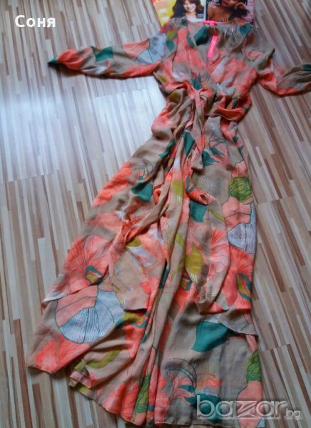 Уникална маркова рокля дълга до земята.Дълъг ръкав,има колан на талията,отдолу с къса подплата седи божествено.Подърък мие но ми е голяма.Супер раздвижен модел.За два закупени артикула поемам доставката