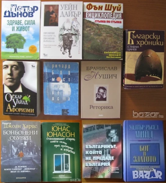 Хермес,2002г.320стр. - 30лв.Оскар Уайлд: Афоризми - двуезично издание: пpeвoд и opигинал,Кибея,2002г.512стр. - 25лв.. Реторика, Бранислав Нушич, - 25лв. Мост през вечността, Ричард Бах - 25лв.Фън Шуй. Енциклопедия стъпка по стъпка,Елизабет Моран, Джоузеф Ю, Вал Бикташев - 30лв. Български хроники,Стефан Цанев,Труд,2006г.504стр. - 20лв.Стогодишният старец, който скочи през прозореца и изчезна,Юнас Юнасонон,Колибри,2013г.384стр. - 20лв. Бонбонени обувки,Джоан Харис,Прозорец,2007г.541стр. - 20лв. Бог и златото,Уолтър Ръсел Мийд,Обсидиан,2010г.624стр.Твърди корици - 85лв. Българинът, който не предаде България,Борислав Йотов,Изд.Нова Звезда,2001г.148стр.Посвещение и Автограф от автора! - 30лв