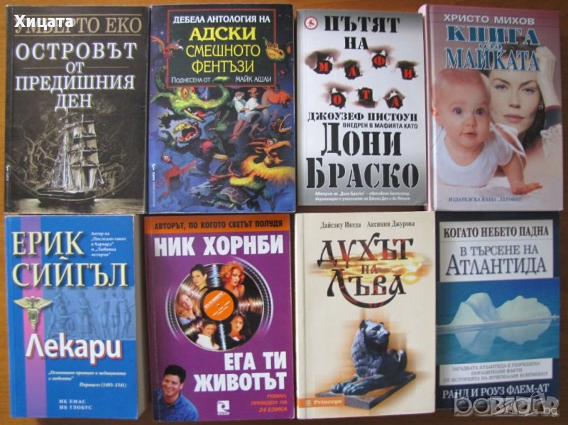 Умберто Еко,Бард,2003г.416стр. - 30лв. Лекари,Ерик Сийгъл , Емас & Глобус,2004г.752стр. -30лв. Духът на лъва,Дайсаку Икеда, Аксиния Джурова,Принсепс,2000г.384стр. -30лв. В търсенето на Атлантида .Когато небето падна,Ранди и Роуз Флем-АТ ,2003г.256стр. - 50лв.Пътят на мафиота.Дони Браско,Джоузеф Пистоун,Свтовна библиотека,2004г.254стр. - 50лв.Книга за майката,Христо Михов,