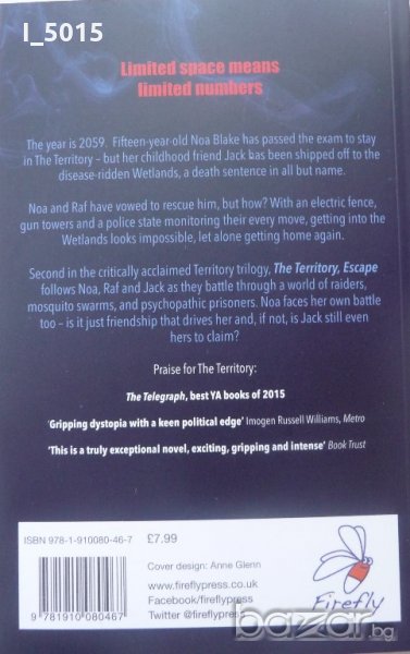 The year is 2059. Fifteen-year-old Noa Blake has passed the exam to stay in The Territory but her childhood friend Jack has been shipped off to the disease-ridden Wetlands, a death sentence in all but name. Noa and Raf have vowed to rescue him, but how? With an electric fence, gun towers and a police state monitoring their every move, getting into the Wetlands looks impossible, let alone getting home again. Second in The Territory trilogy, The Territory, Escape follows Noa, Raf and Jack as they battle through a world of raiders, mosquito swarms and psychopathic prisoners. Noa faces her own battle too is it just friendship that drives her and if not, is Jack still even hers to claim?
