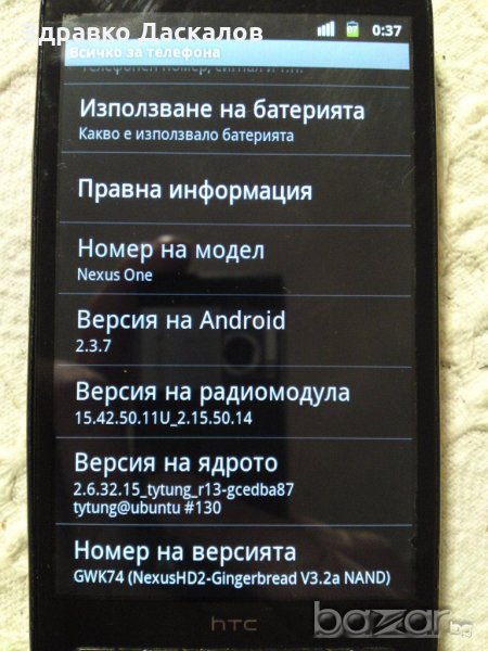 Телефона е със инсталиран Андроид 2.3 на вътрешната памет.Работи без проблем,само червената слушалка за край на разговора не работи.Телефона се включва като се сложи на зарядно.Продава се само телефон и батерия,без зарядно.
