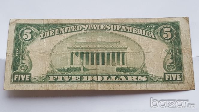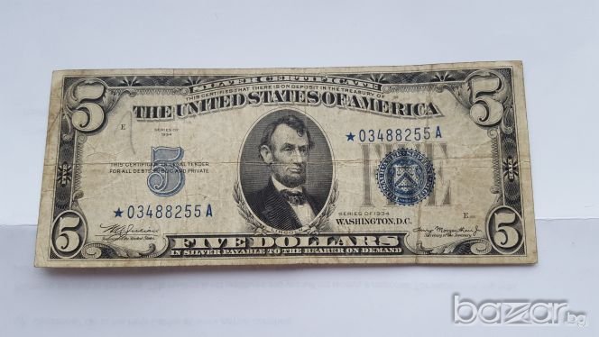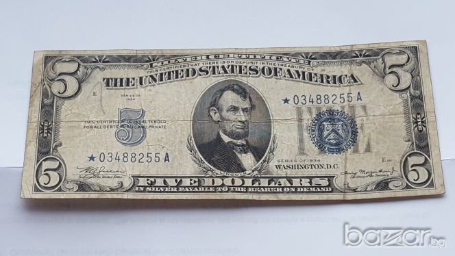 $ 5 ДОЛАРА от 1934 год.СРЕБЪРЕН СЕРТИФИКАТ ☆ с ЗВЕЗДА Преди Серийният Номер. Добре Запазена Банкнота.