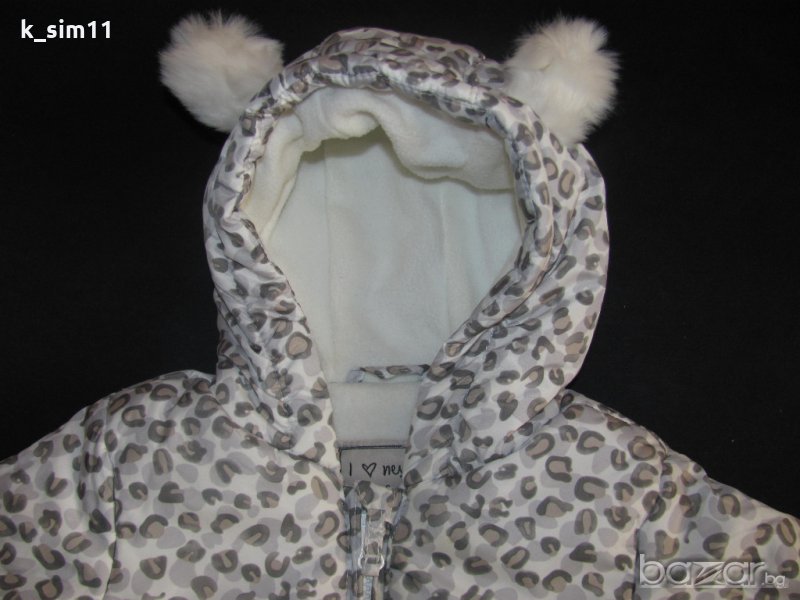 Зимен топъл космонавт /ескимос/ на марката Next за 6-9 м. Космонавта е с леопардов десен, подходящ за студените и мокри зимни дни, подплатен е с полар. Закопчава се с цип, на кръста с ластик, ръкавите са с ластици за да не влиза студ, а крачолите с буйки, които не се свалят. Отлично състояние, носен е 2-3 пъти.