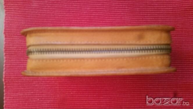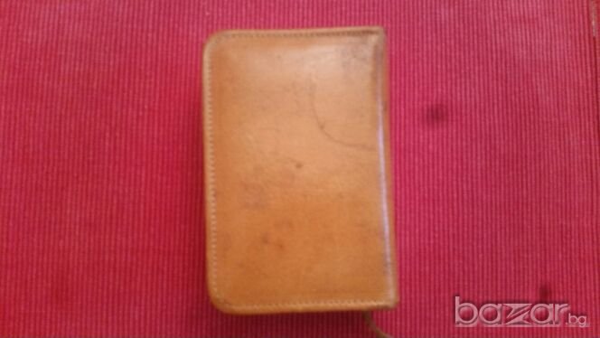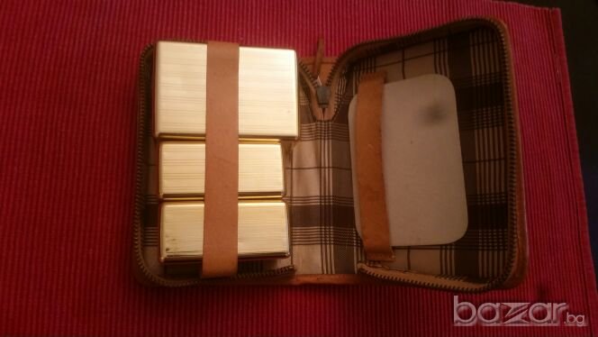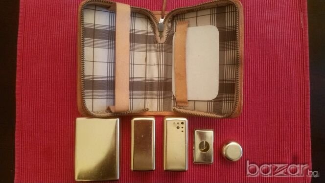 Стар туристически несесер. Комплекта е от алуминий, несесера е от естествена кожа.