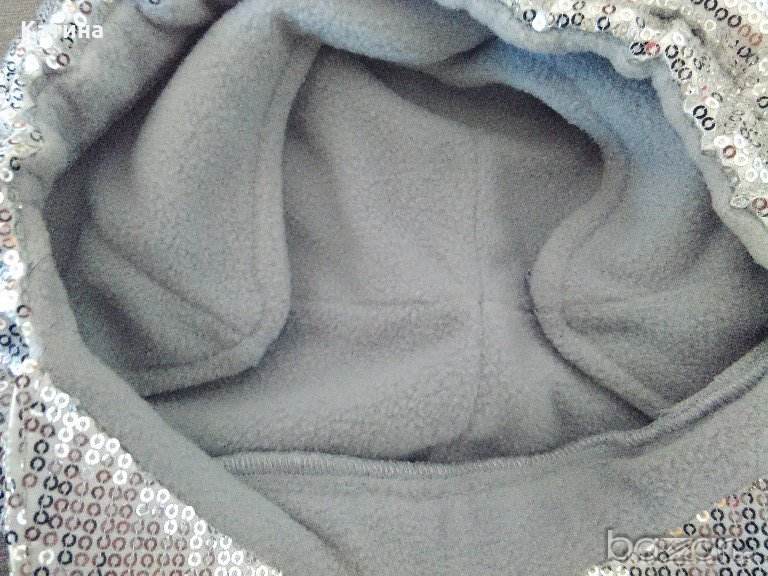 Страхотна шапка с козирка,цялата осеяна с малки сребристи пайетки. Мека поларена подплата(тип ушанка),което прави шапката подходяща за студени зимни дни.Размер 54-56 см.Нова.