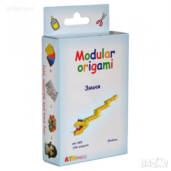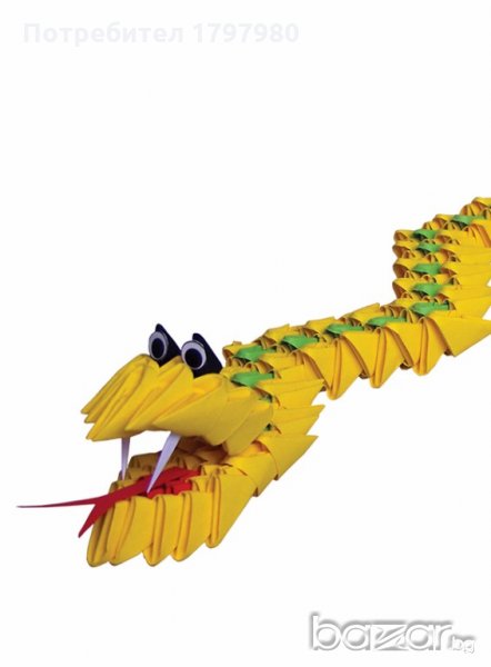 Змия -198 модула, размер на готовия модел - 30/6 см, размер на листчетата за сгъване - 5/3 см.