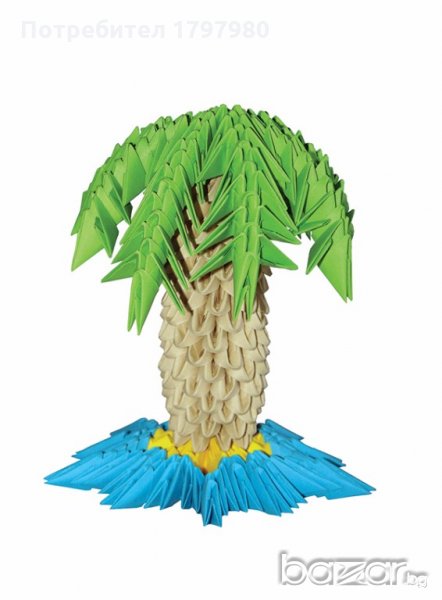 Комплектът съдържа набор от цветни листчета и подробни илюстрирани инструкции за сгъване на модулите и сглобяване на една палма.