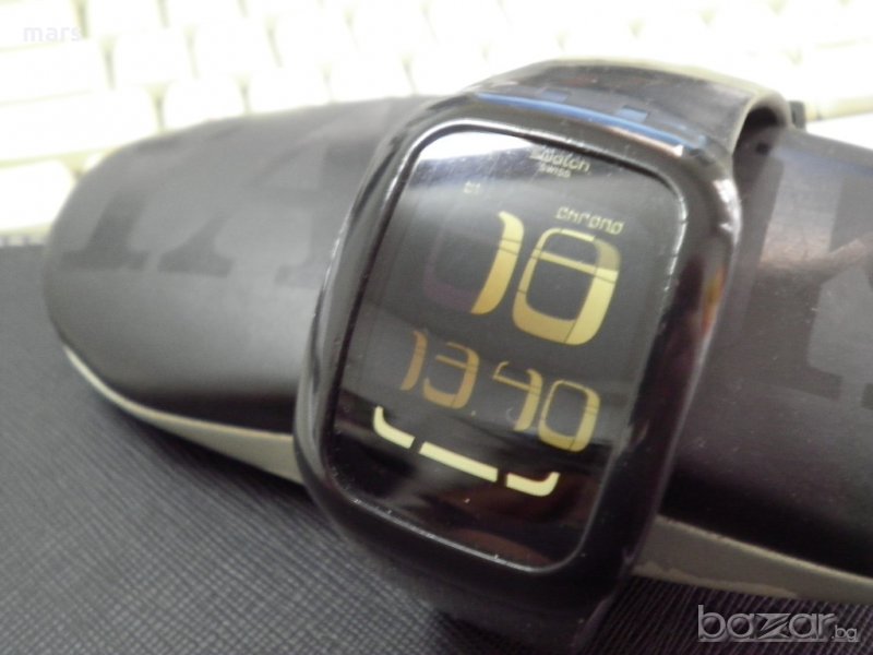 • Швейцарски часовник swatch touch black, модела е презентиран през 2011г. и се превръща в култов за марката - дизайн без бутони, като функциите се командват и контролират изцяло чрез тъч-скрийн зоната на дисплея. Размери: - 52.6мм./39.00мм./11.9мм., водоустойчивост - 3 бара.