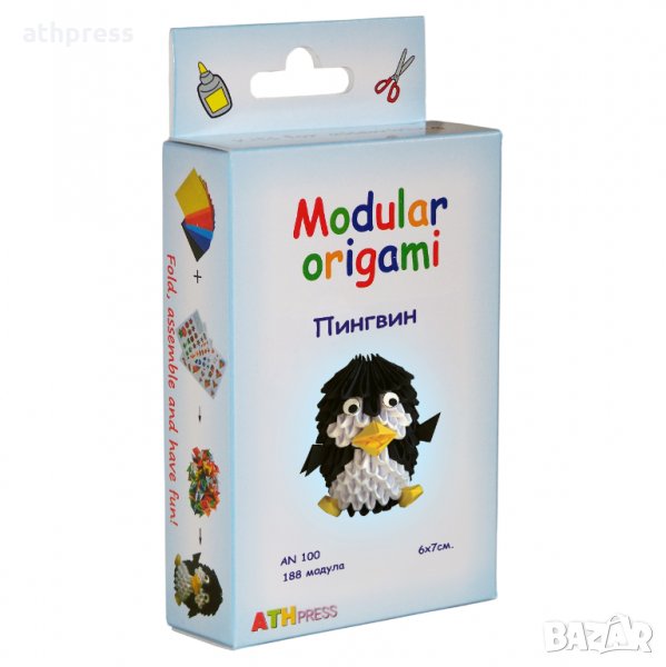 Modugami Easy Fold Пингвин - 188 модула, размер на готовия модел - 9/11 см, размер на листчетата за сгъване - 8/5 см, цена - 8.00 лв.