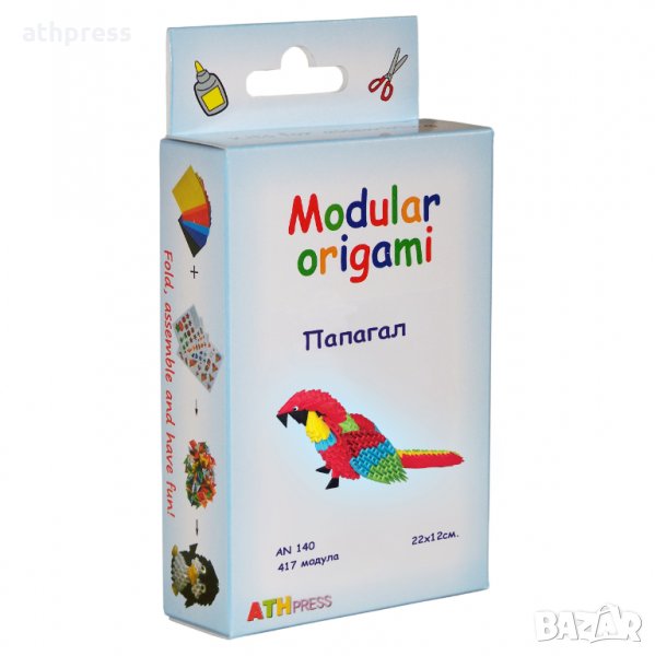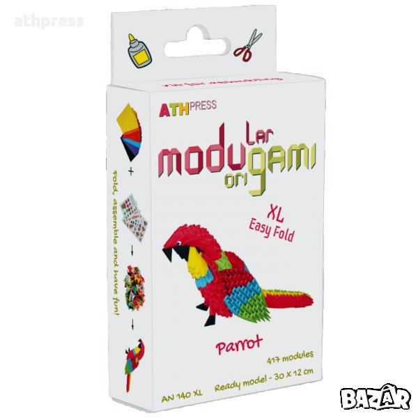 Modugami Easy Fold Папагал - 417 модула, размер на готовия модел - 30/12 см, размер на листчетата за сгъване - 8/5 см, цена - 13.60 лв.
