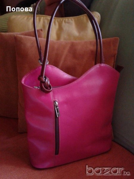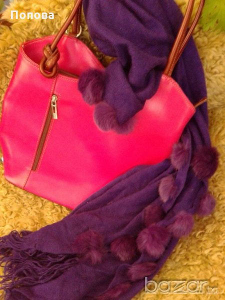 Уникален сет в перфектно състояние. В толкова искрящи цветове и стилни ,че няма как да не ви забележат. Италианска маркова чанта от естествена кожа в страхотен бонбонен цвят и лилава наметка с естествени кожи за декорация. Чантата е слагана няколко пъти и изглежда като нова. Размер 32 см.,на 9 см.,на 24 см. височина до ципа ,иначе до края на кожата е 29 см.Едно основно отделение ,разделено на 2 с отделение с цип по средата .Дръжките са преплетени и са с дължина 65 см..Единствено ,като забележка мога да сложа една малка чертичка от химикал от едната страна,която съм снимала.Наметката е с размер 156 см. дължина с ресните и 72 см. ширина без топките. Съдържание на вълна в материята.Уникални на живо.Цената е без коментар.