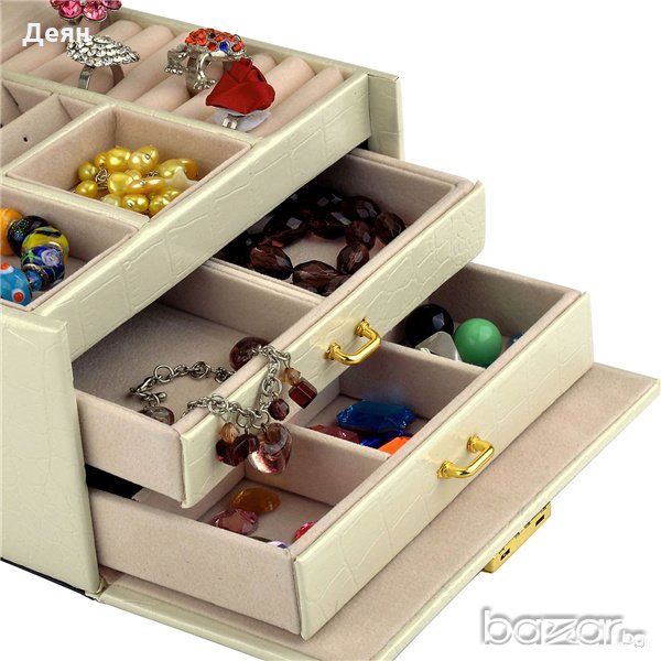Тази специална кутия е страхотен подарък за всеки любител на красивото и практичното. Моделът е стилно решение на проблема с организацията на бижутата и аксесоарите, както и на някои козметични продукти. Отвън кутията е облицована с елегантна синтетична кожа, а вътрешността е от мек велур, който защитава бижутата и аксесоарите.