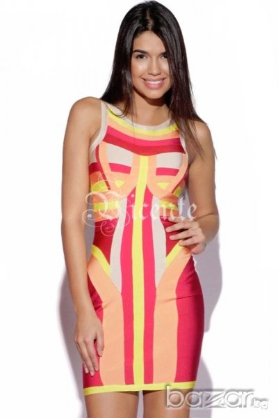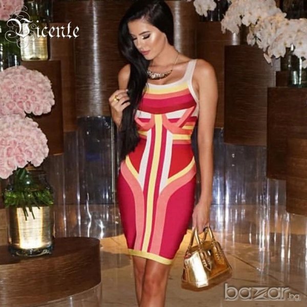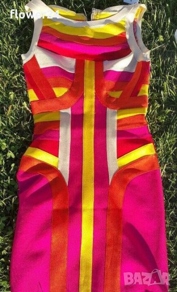 Уникална бандажна рокля, стои страхотно! Ярки цветове. Обличана е 1 път на повод. Без забележки и следи от употреба. По модел на Herve Leger. Разтяга се така, че ще стои добре на дами, носещи размер С и М.
