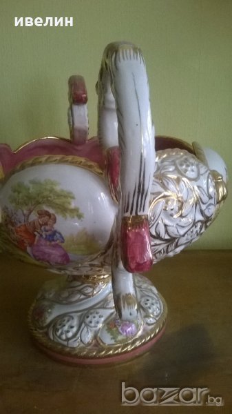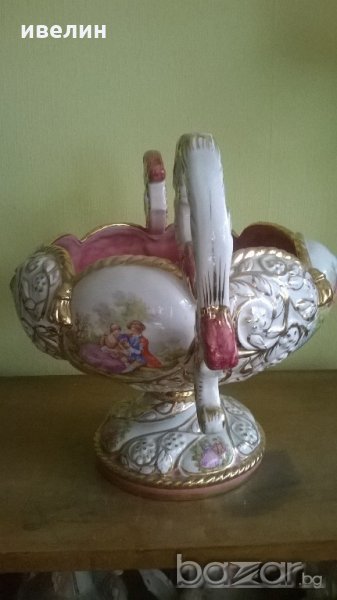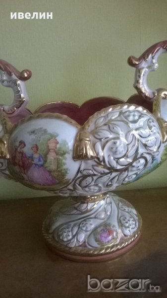 барокова купа,фруктиера.материал-порцелан.декорирана с рисунки-вато.висока е 32см,ширина 43см,диаметър на отвора 26см.