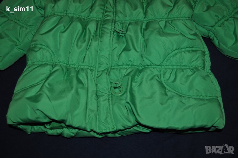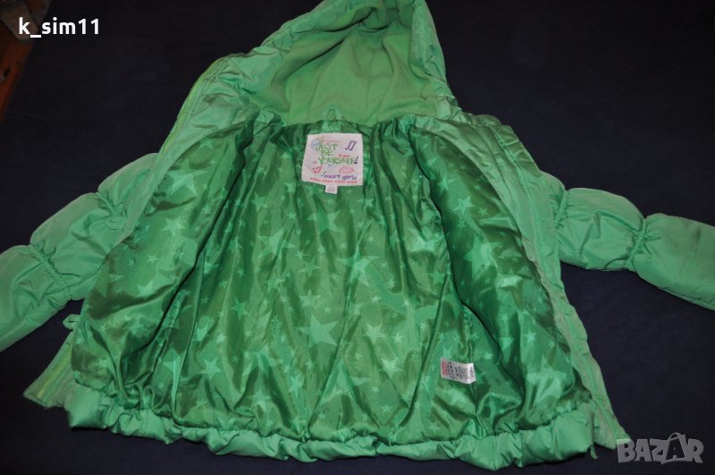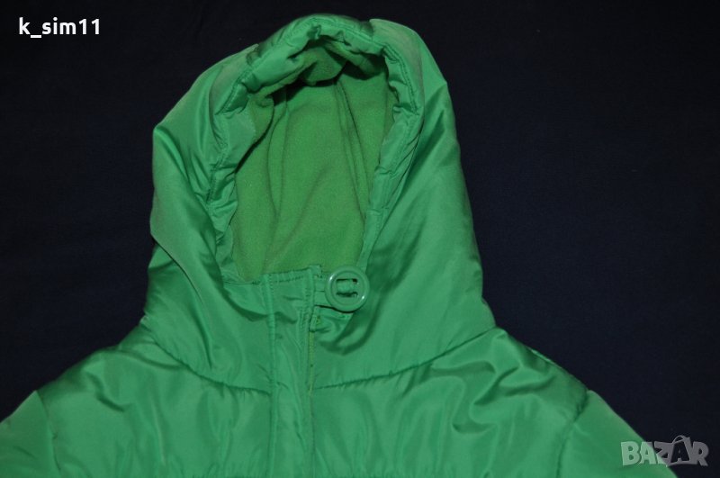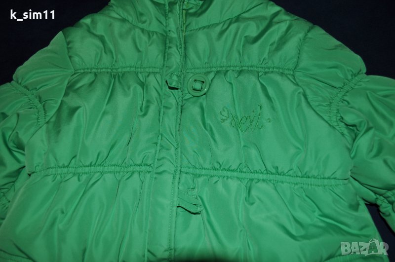 Топло зимно яке на Next за 7-8 г. Цветът е зелен, красива подплата на панделки, наборите са ластични, закопчава се с цип и копчета, 2 джоба, качулката не се сваля. Топло, модерно, не пропуска вода. Състоянието му е много добро, липсва едно копче.
