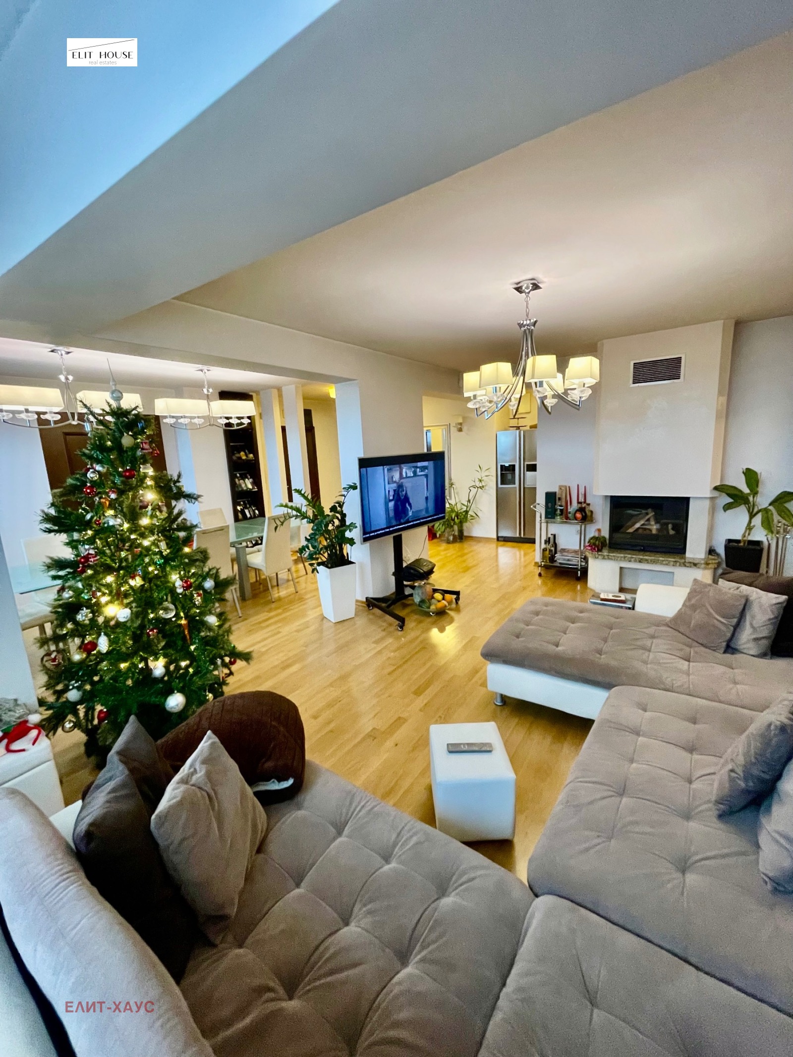 мрамор, естесвен паркет, гранитогрес, жилището е със следното разпределение: входно антре, просторна дневна с трапезария и камина, самостоятелна светла кухня оборудвана с уреди Бош, втори хол с красива библиотека и панорамна остъкклена тераса гледаща към парка и Витоша, 4 спални с 4 бано и тоаелтни, мокро пощение с място за гладене и сушене, родителската спалня е много просторна с огромна баня и тоалетна с сауна, разкошен голям дрешник и панорамна тераса преобразувана в малък фитнес, апартамента се продава напълно обзаведен, за повече информация на посочения телефон: 0886100882