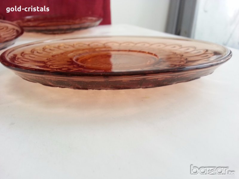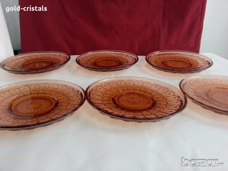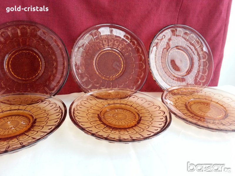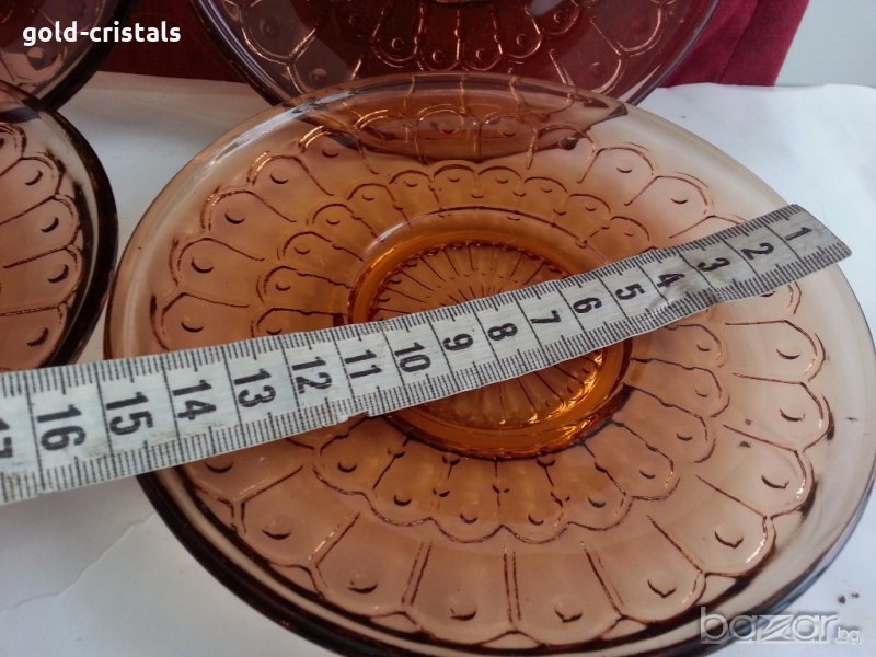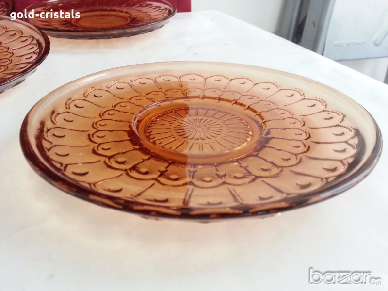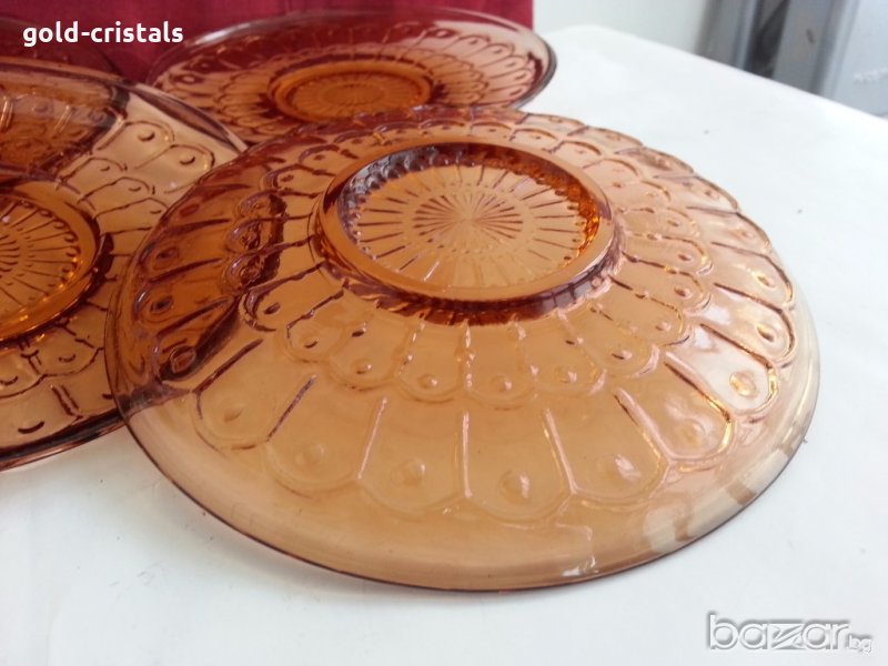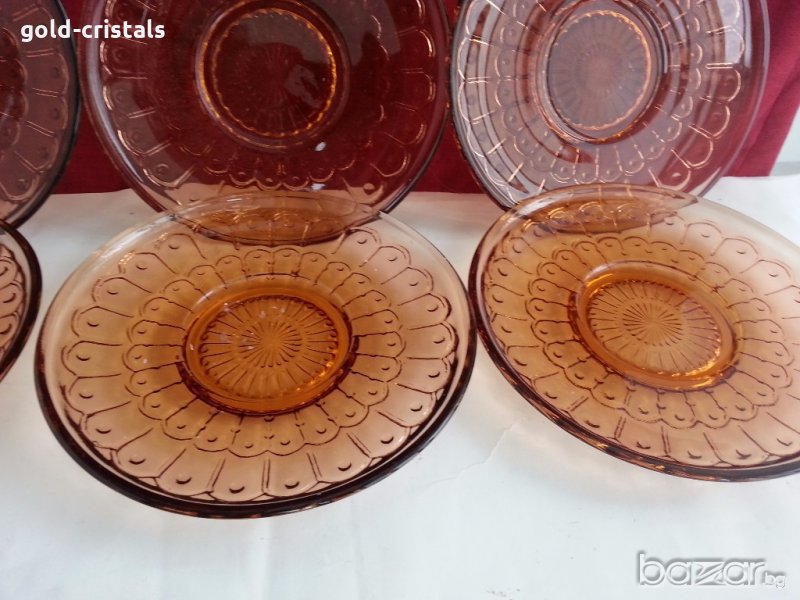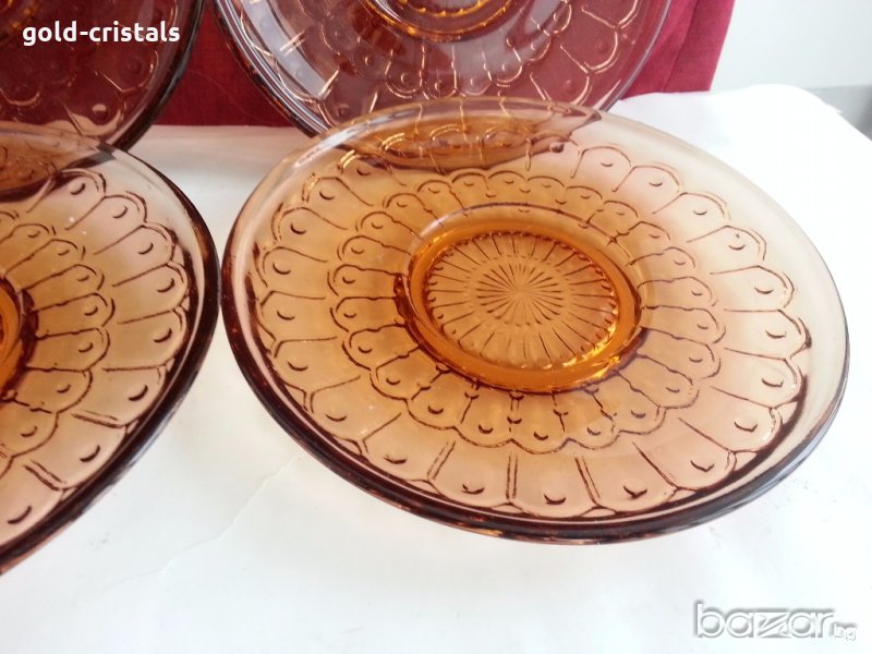 Антикварен стъклен сервиз чинии цветно сткъкло цвят кехлибар старо българско производство никога не е използван комплект сет лот стари старинни ретро арт декор винтидж колекция стари антикварни предмети обзавеждане за дома и семейството подходящи за подарък за ценители и колекционери