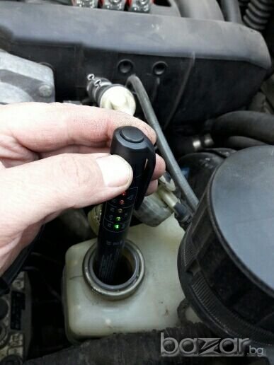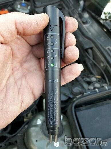 тестер за наличие на вода в спирачната течност.Натиснете бутона от горе. Светва най-долният зелен светодиод показващ статуса на батерията (ОК). Ако светнат всичките светодиоди (зелен, 2 жълти и 2 червени) батерията е за смяна.( трябва 1 бр. ААА батерия).След 10 сек. тестера се гаси автоматично.Свалете капачката на тестера прикриваща двата електрода.Потопете електродите в спирачната течност (не потапяйте пласмасовата част на тестера)Натиснете бутона от горе.1. светва зелен светодиод - няма наличие на влага в сп. течност.2. светва зелен и жълт светодиод - по-малко от 1% влага в сп. течност.3. светва зелен и 2 жълти светодиода - по-малко от 2% влага в сп. течност.4. светва зелен, 2 жълти светодиода и червен - приблизително 3% влага в сп. течност. Спирачната течност трябва да се смени.5. светва зелен, 2 жълти светодиода и 2 червени - повече от 4% влага в сп. течност. Спирачната течност задължително е за смяна.