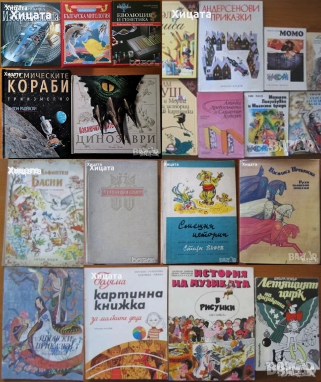 Еволюция и генетика.Илюстрована Научна Енциклопедия Britannica Том 3,Атеа Букс,2010г.94стр. - 55лв. Изобретенията.Енциклопедична поредица Откривател,Глен Мърфи,Фют,2008г.64стр. - 60лв. Българска митология: Богове и герои,Цанко Лалев,Пан,2009г.48стр. - 60лв. Космическите кораби.Триизмерно,Антон Радевски,Кибеа - 60лв. Изключителните динозаври,Робърт Маш,ИнфоДар - 60лв. Детето със силна воля,Възпитавай докато можеш!,Д-р Джеймс Добсън - 15лв. 365 дни за творчески игри,Шийла Елисън,Джудит Грей - 80лв. 365 начина да възпитаваме прекрасни деца,д-р Барбара-Ан Барнет, Шийла Елисън.- 80лв Мъдрото дете,Соня Чокет - 50лв.Тайният духовен свят на децата,Тобин Харт - 15лв. Алиса в Страната на чудесата.Алиса в Огледалния свят,Луис Карол,Труд,2002г.228стр. - 35лв. Макс и Мориц и други истории в картинки,Вилхем Буш,Труд,2000г.120стр. - 20лв. Приказка без край,Михаел Енде,Отечество,1990г.344стр.Твърди корици - 15лв. Момо,Михаел Енде,Отечество,1982г.280стр. - 15лв. Приказки за страната Алабашия,Карл Сандбърг,Отечество1979г.202стр. - 15лв. Аничка Дребосъчето и Сламения Хуберт.Приказна повест, Витезслав Незвал,Отечество,1981г.368стр. - 20лв. Приказен свят,Ангел Каралийчев,Народна младеж,1954г.260стр. Отбрани приказки и разкази под редакцията на Симеон Султанов.Илюстрации - Проф.Илия Петров - 80лв Смешни истории (Страх-страшилище / Учен Петко / Капанът на дядо Пею),Орлин Василев / Асен Босев / Здравко Сребров,Български художник,1971г.50стр.Художник Стоян Венев.Изключително запазена! - 60лв Василиса прекрасна.Руски вълшебни приказки,Радуга,1984г.216стр.Отлична с леки забележки! - 60лв Японски приказки - 25лв.Басни Жан дьо Лафонтен ( с илюстрации от Кремонини) ,изд.Народна младеж,1960г.твърди корици - 40лв; История на музиката в рисунки, Бернар Дейри, Дени Льомери, Михаел Садле- 20лв.Голяма картинна книжка за малките деца,Милена Лукешова, Бохумил Ржиха,Народна младеж,1984г.192стр.- 25лв. Летящият цирк на физиката,Джърл Уокър ,Наука и изкуство,1985г.437стр.- 25лв. Корейски народни приказки,Превод от корейски Куон Джин Чой,НКИА ООД,1998г.81стр. - 25лв. Радост ,Корней Чуковски,Малыш,1981г.80стр.(стихотворения и гатанки) - 15лв.Откъде извира Даугава,Латвийски народни приказки,Народна младеж,1974г.246стр. - 20лв.Хиляда и една нощ. Приказките на Шехерезада. Книга 2,320стр. - 20лв.
