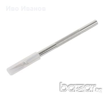 Стоманен резец скалпел за прецизно и точно изрязване. Дръжка Ф8 от неръждаема стомана с отвиващ се наконечник за сигурно закрепване на острието с накатка за удобно захващане без приплъзване.