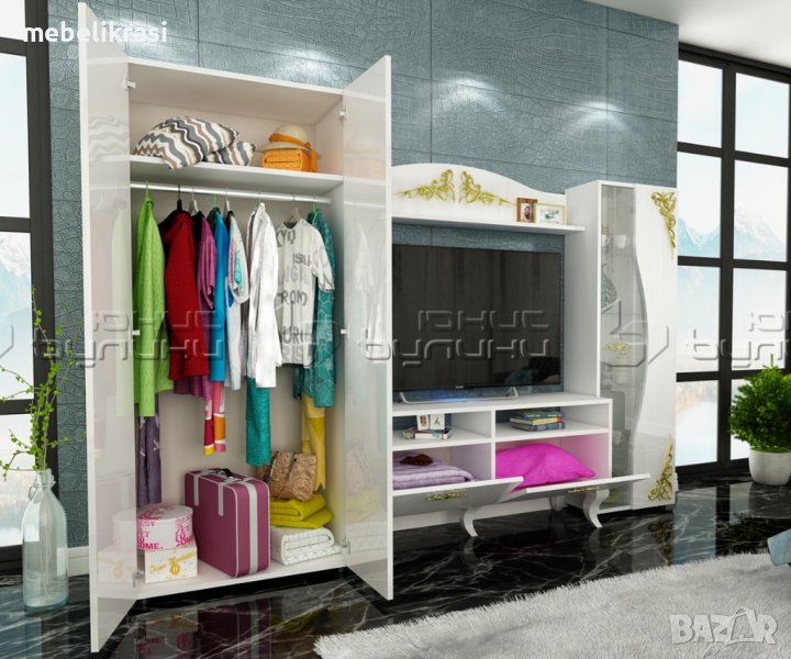 Секция "Изабела"- предложение за обзавеждане на дневна или хол. Състои се от шкаф с витрина, двукрилен гардероб, ТВ шкаф и етажерка. Вратичките имат плавно затваряне. Секцията има характерни релефни ПВЦ орнаменти, които могат да бъдат златисти или бели, по Ваш избор.