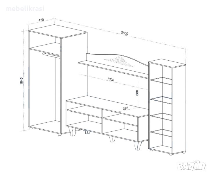 ширина 2600 мм./дълбочина 470 мм./височина 1845 мм.