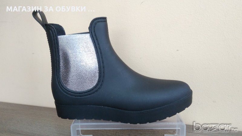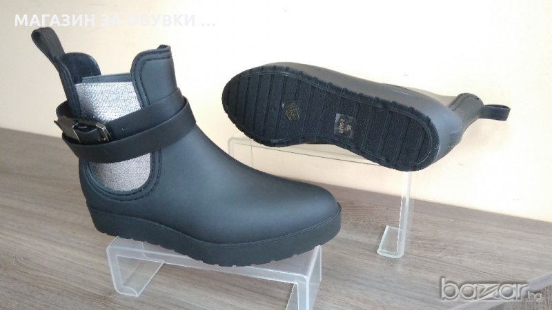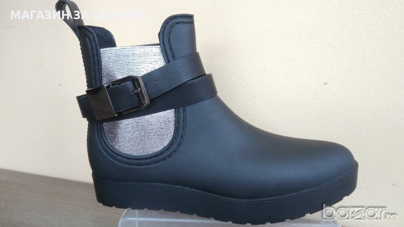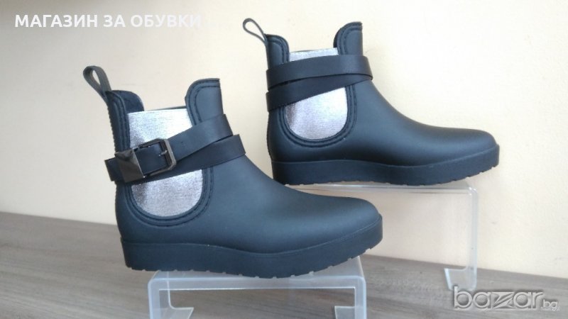 Дамски боти в черен матиран цвят, изцяло изработени от гума. Подметката е лята, което е абсолютно сигурно, че няма да пропускат вода и влага. Подходящи за мокрите есенни и зимни месеци! От двете страни на глезена имат широк ластик в сребристо, за лесно обуване. Може да се носят и без коланчето! Дължина на стелка - № 37-24см № 38-24,5см №39-35,5см № 40-26 см. Изпращам с преглед и тест преди заплащане. Отстъпка от куриерската такса.